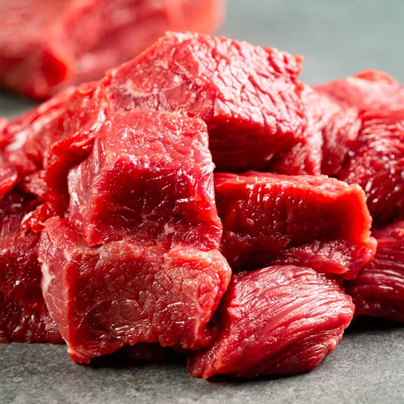Rohes Rindfleisch in Würfeln auf grauer Oberfläche. Rindergulasch mit Kartoffeln und Karotten in brauner Sauce, Petersilie garniert, serviert in einer weißen Schüssel.