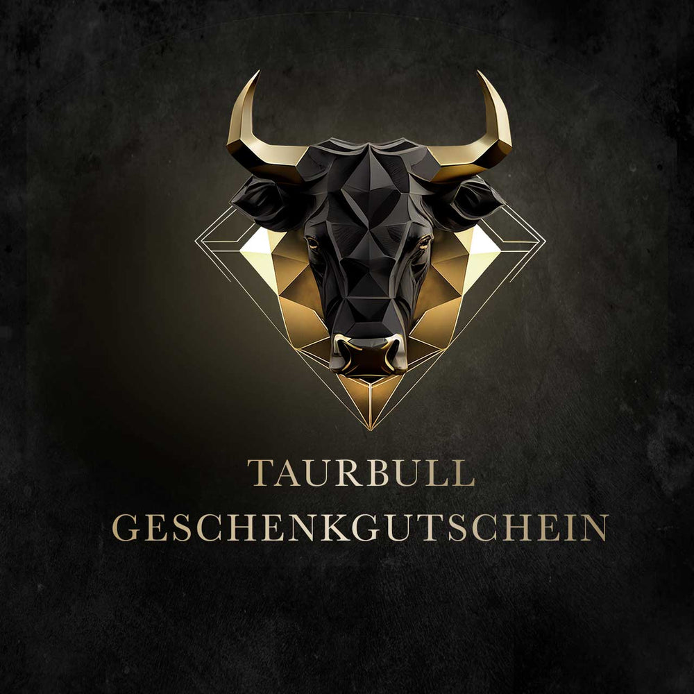 Premium Black Angus Ribeye Steak von TAURBULL, Black Angus, roh, perfekt marmoriert. Ribeye-Steak mit Kräuterbutter, knusprigen Ofenkartoffeln und Mikrogrüns auf dunklem Teller