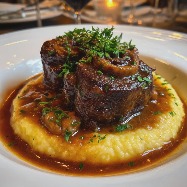 Das Osso Buco (Beinscheibe) wird aus der Hinter- oder Vorderwade des Rindes geschnitten. Dieser Bereich ist besonders muskelreich, wodurch das Fleisch beim Schmoren eine butterzarte Konsistenz erhält. Der Knochen mit Mark gibt dem Gericht eine besonders tiefe, aromatische Note.